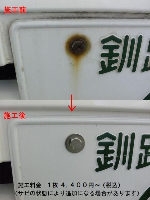 浜風や融雪剤等の塩害によってサビついたナンバープレートのボルト周辺の