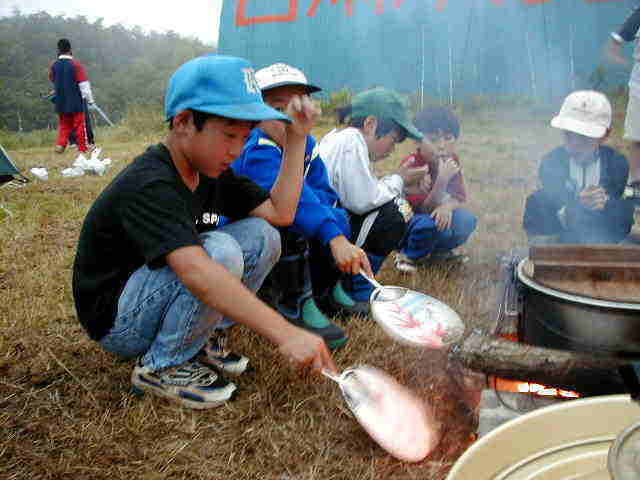 小雨も何のその、自分達で作ったご飯はおいしい! |