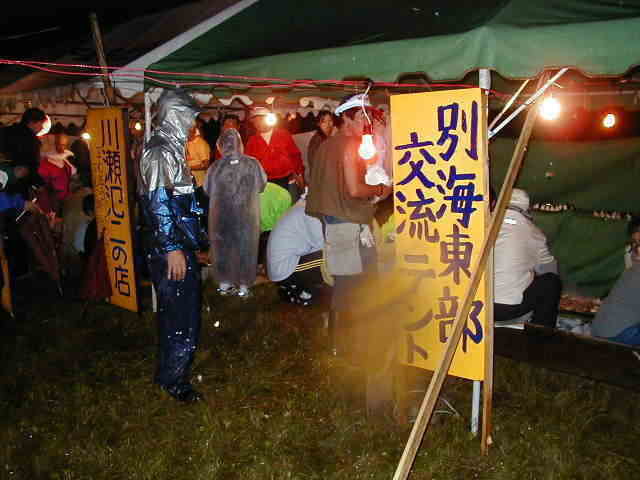 雨降る中、本部テント内で前夜祭〜交流会 |