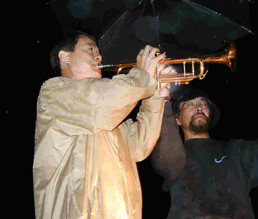 ![]() 労働者トランペッタ―・松平晃さん やぐらの上から平和への祈りをこめて |