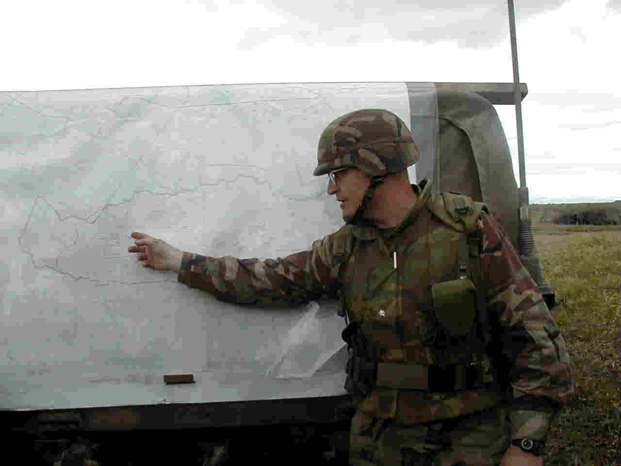 演習公開日 砲撃発射地点で演習場の地図を使って説明するD・A・ケリー大隊長