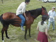 | 馬と親しむコーナー 地元の獣医・高橋昭夫さんの指導で鞍なしで馬に乗る | 一か月ぶりの晴れ間 くつろぎながら耳を傾ける | |