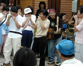 | みんなでビッグフィナーレ・聖者の行進をうたう | 根室市から参加した女性ボーカリスト | スワンの家ハーモニカ隊とまよなか・しんやさん |