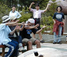 障害を持った方々の共同作業所「スワンの家」が営む喫茶店「ふれあいの家」前にみんな集まりました。