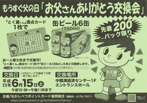 2006年度イベント一覧もうすぐ父の日 お父さんありがとう交換会 ![]() 父の日のイベントとして、お父さんありがとう交換会を実施いたします。 満点カード1枚で、缶ビール6缶(350ml)と交換いたします。 ぜひ、お父さんへのプレゼントとしてご利用ください。 ※お子様や未成年の方は交換出来ません。ご了承ください。 実施日時:平成24年6月15日(土)午前10時〜午後1時まで ※先着200パック限り なくなり次第終了いたします。 お一人様 満点カード 5枚分まで交換できます!! 交換場所:中標津経済センター(なかまっぷ)1Fエントランスホール 2007年度イベント一覧 2008年度イベント一覧 2009年度イベント一覧 2010年度イベント一覧 2011年度イベント一覧 |