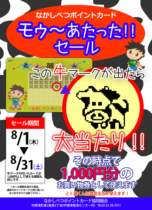 お買い物はポイントカード加盟店で!な かしべつポイントカード とく蔵くん![]() |