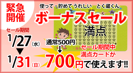 「とく蔵くん ボーナスセール」 先日の満点カード交換会では、予想以上の交換数で、 多くのお客様が交換できずにお帰り頂く事となってしまいました。 大変申し訳ございませんでした。 つきましては、満点カードがお得に使えるボーナスセールを 緊急開催させて頂きます。 緑色の満点カードが使えるラストイベントとなりますので、 満点カードをお持ちのお客様は、この機会にぜひご利用ください。 ![]() 一度に何枚でもご利用できます。加盟店全店でご利用できます。 ご利用の際は、満点カード裏面にお名前と電話番号をご記入の上、 ボーナスシールとともにご提示下さい。 ボーナスシールは加盟店にございます。 平
